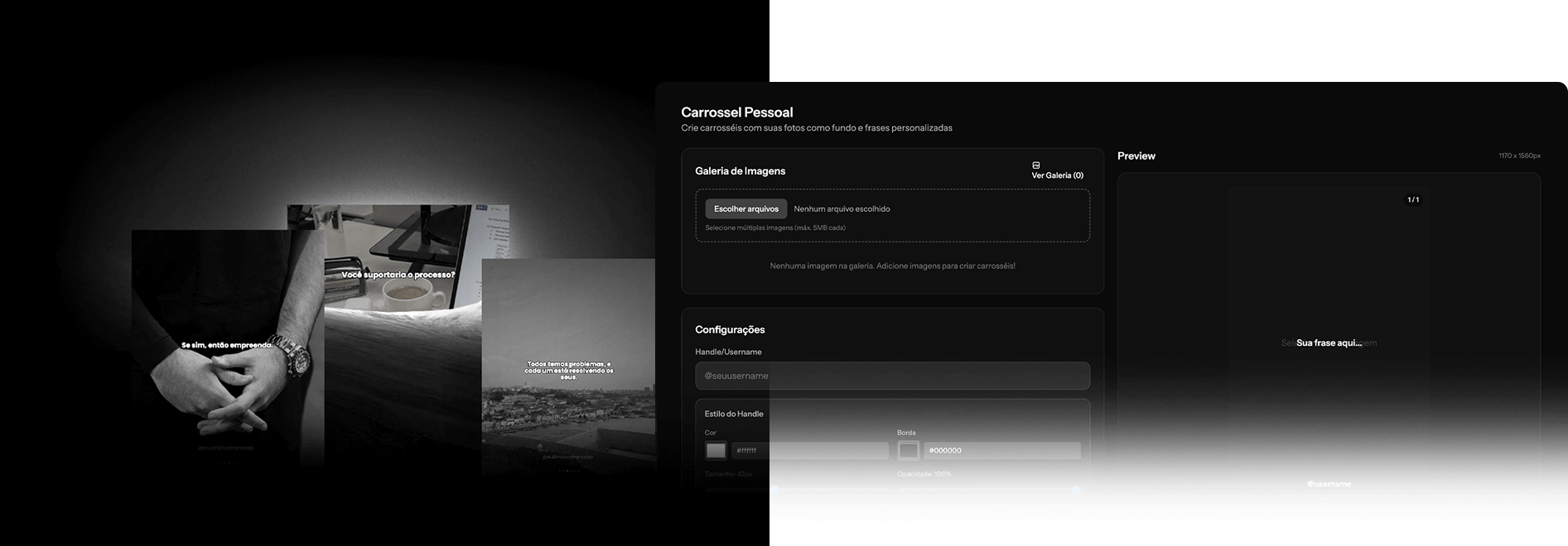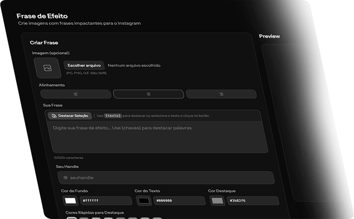 Digite uma frase, adicione seu @ e gere automaticamente uma arte limpa, direta e pensada para engajamento.