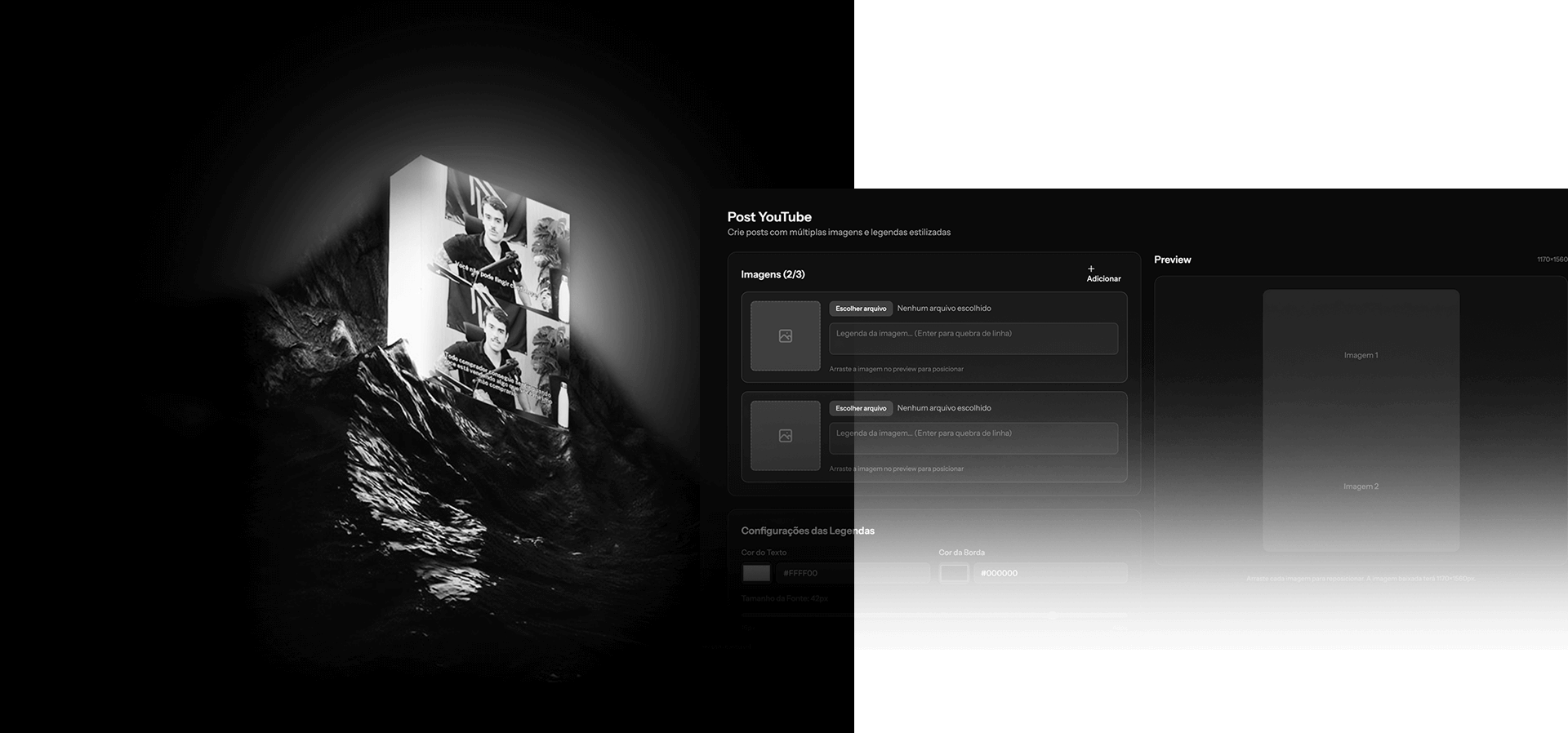 Combine duas ou três imagens em um único layout vertical, com textos posicionados estrategicamente.